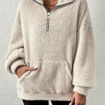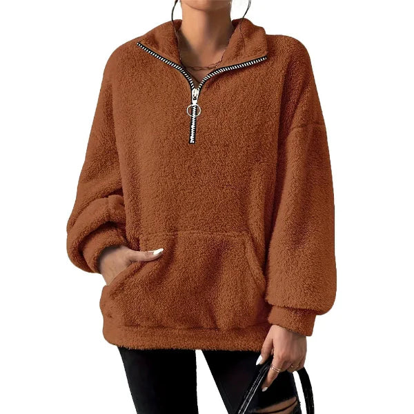 Damesweatshirt – Oversized pasform – Blød fleece – Halv lynlås – Høj hals – Kængurulomme