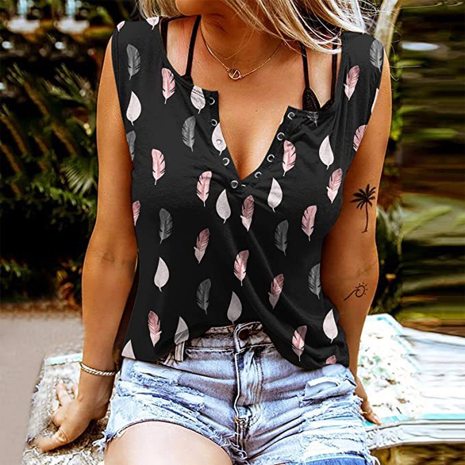 Dametanktop – Løs pasform – V-hals med knap – Fjerprint – Åndbart stof