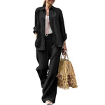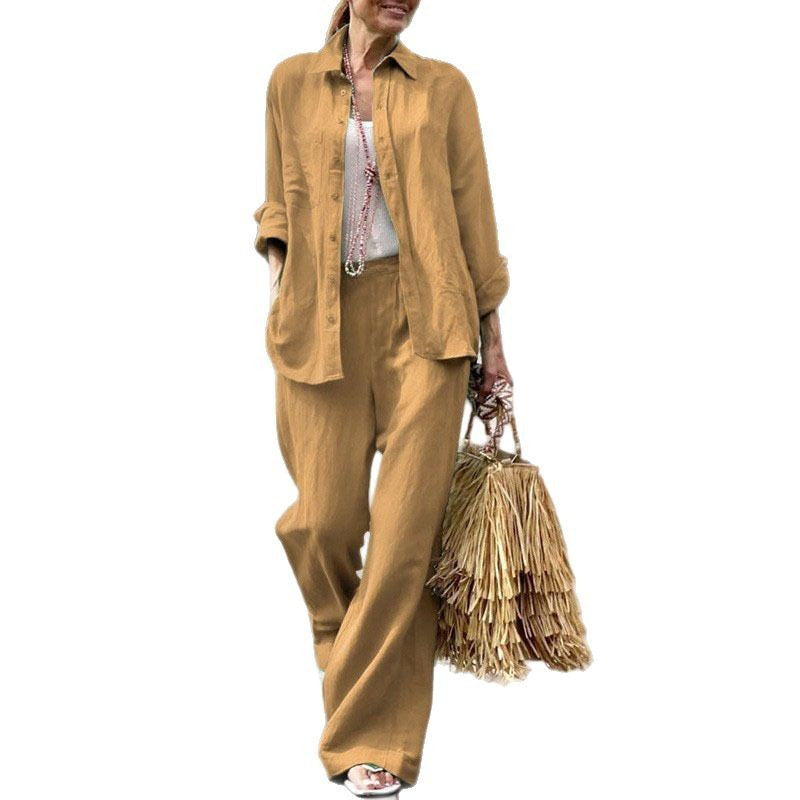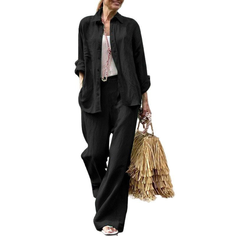 Damesæt med skjorte og bukse – blød bomuld – vide ben – lange ærmer, skjortekrave