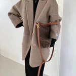 - Design: Oversized snit, dobbeltradet, skræddersyet krave