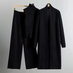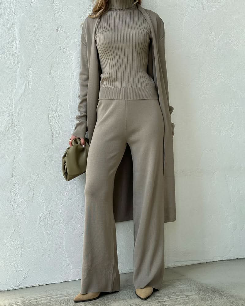 Løft din garderobe med vores **Cozy Luxe Set**, en perfekt blanding af komfort og elegance. Dette tredelte sæt indeholder en stilfuld ribbet rullekrave, bukser med vide ben og en lang, elegant skræddersyet cardigan, alt sammen designet til at holde dig elegant og komfortabel.