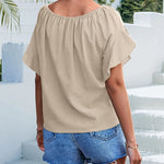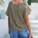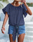 Den runde hals og de korte, flagrende ærmer skaber en flatterende silhuet, mens det unikke design med bindebånd foran tilføjer et håndlavet touch, der giver mulighed for en brugerdefineret pasform. Kombineret med klassiske denimshorts indfanger denne bluse sommerens ånd med en afslappet boheme-charme, ideel til stranddage, afslappede udflugter eller dovne eftermiddage i solen.