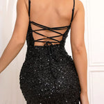 Kort pailletteret aftenkjole med V-hals og åben ryg