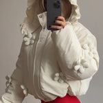 Kort quiltet frakke med hætte og 3D-blomsterflæser