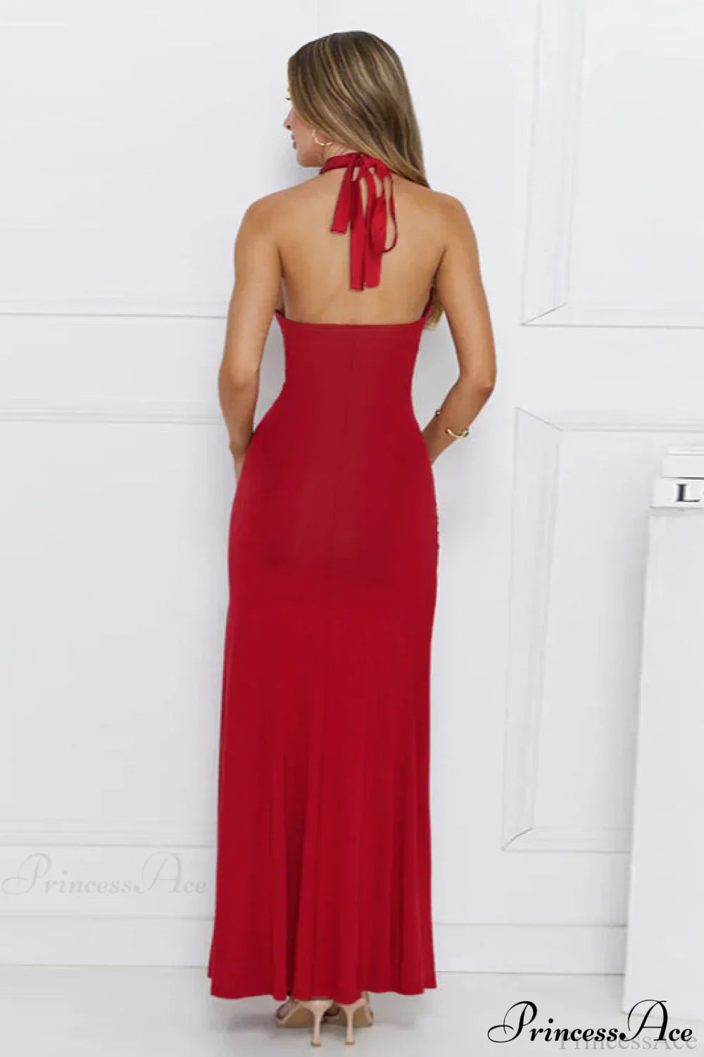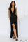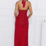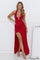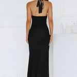 Lang, tætsiddende aftenkjole med V-udskæring og åben slids i ryggen