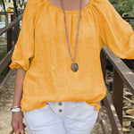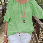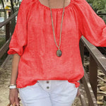 Dametop – Løs pasform – Hør og bomuld – Trekvartlange ærmer – Rund hals med rynket halsudskæring