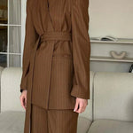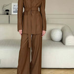 Todelt kontorsæt: brune bukser med V-hals og snørebånd