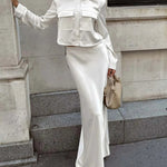 Todelt sæt: slank hvid maxinederdel med opsmøg i ærmerne til kontoret