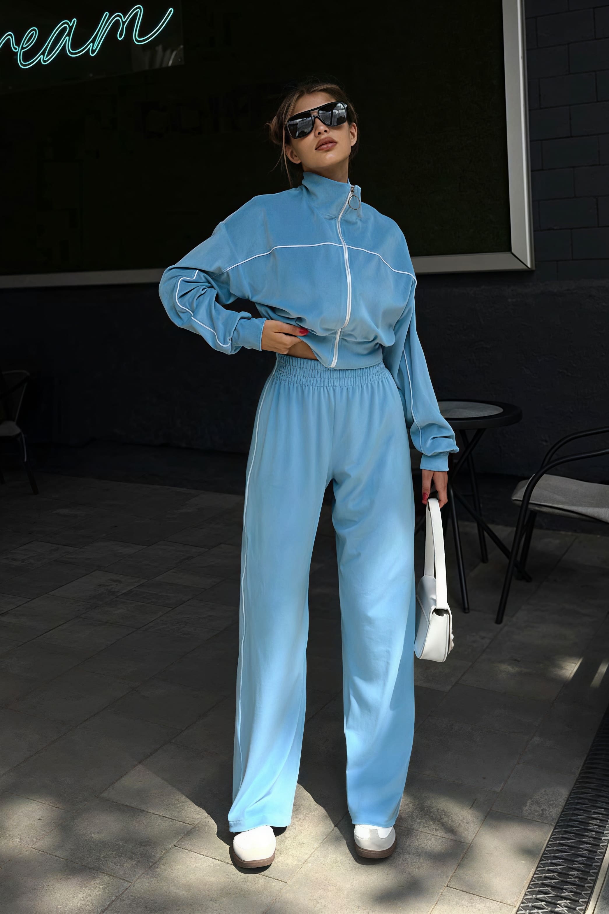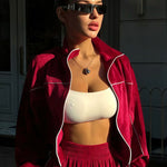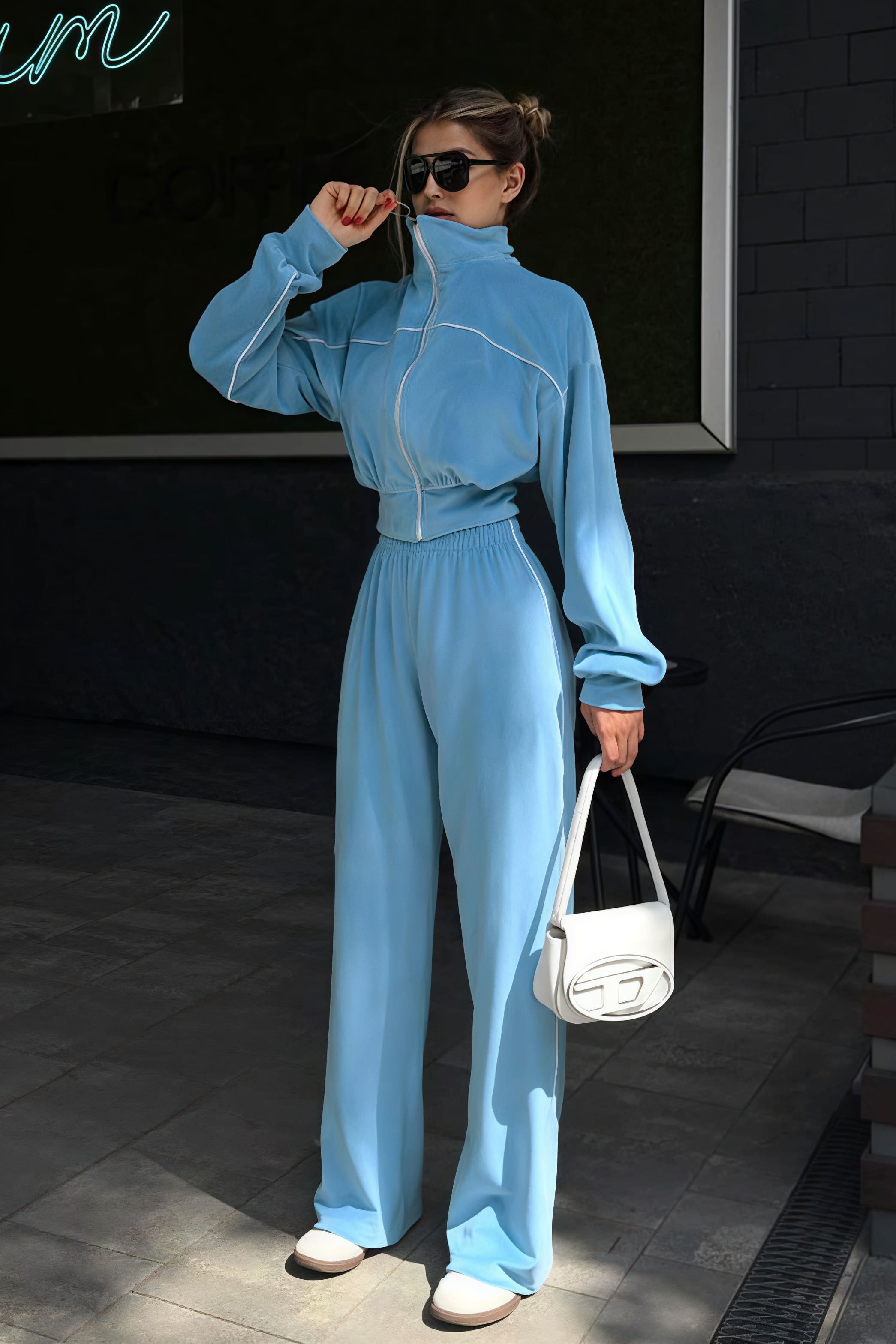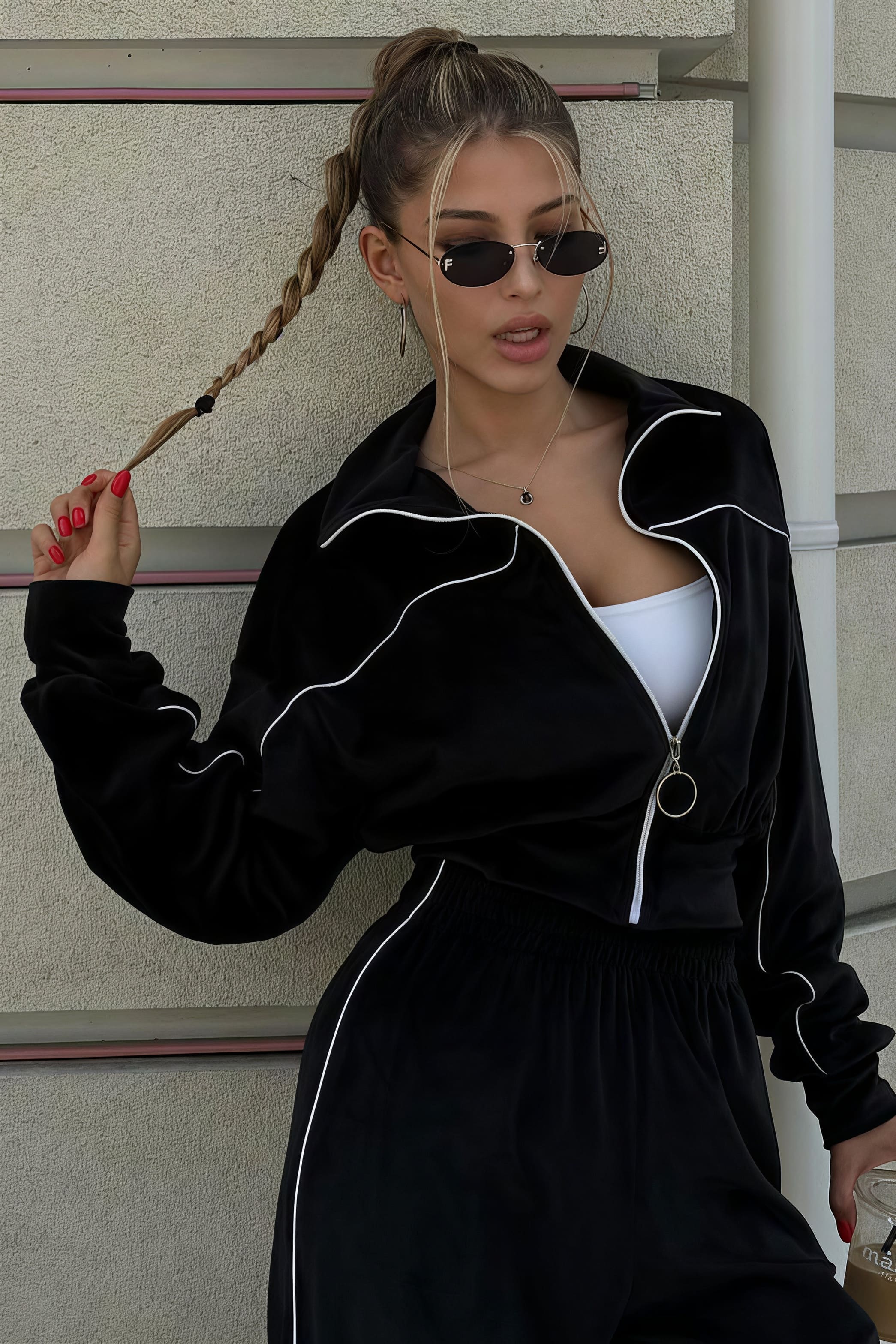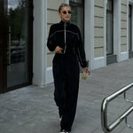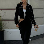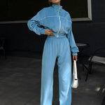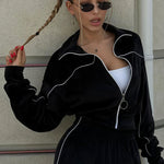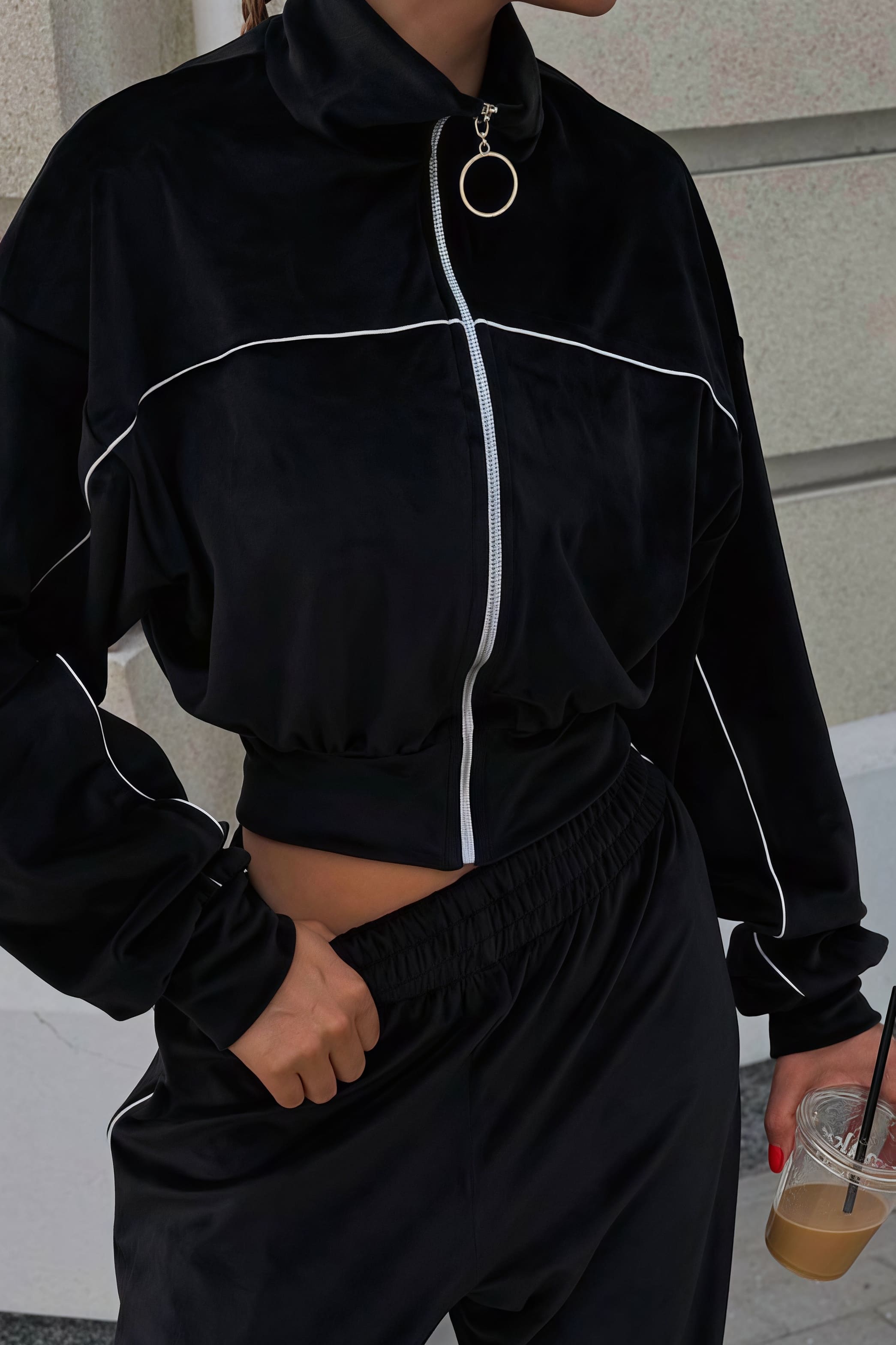 Todelt sæt med lange ærmer, en atletisk fløjlskrave og lynlåslukning.