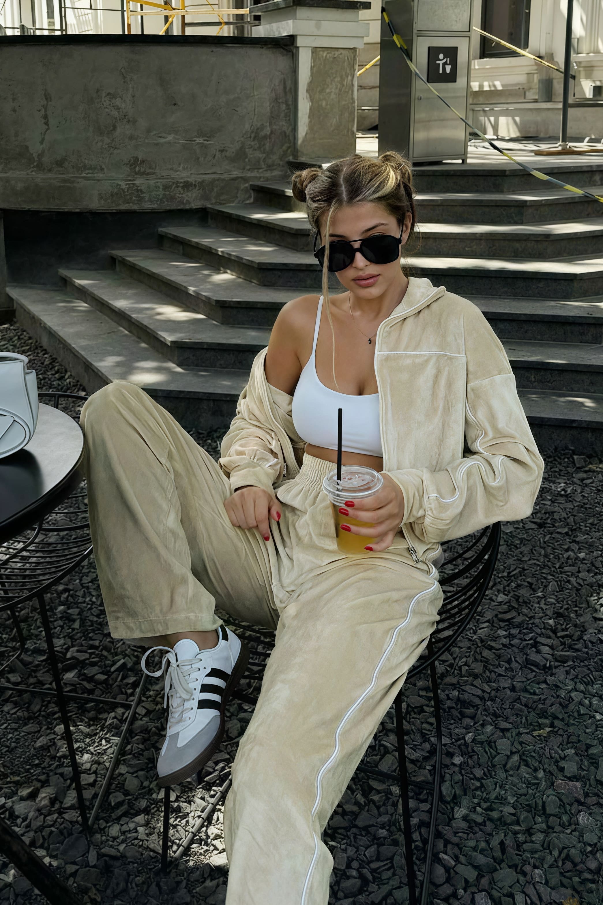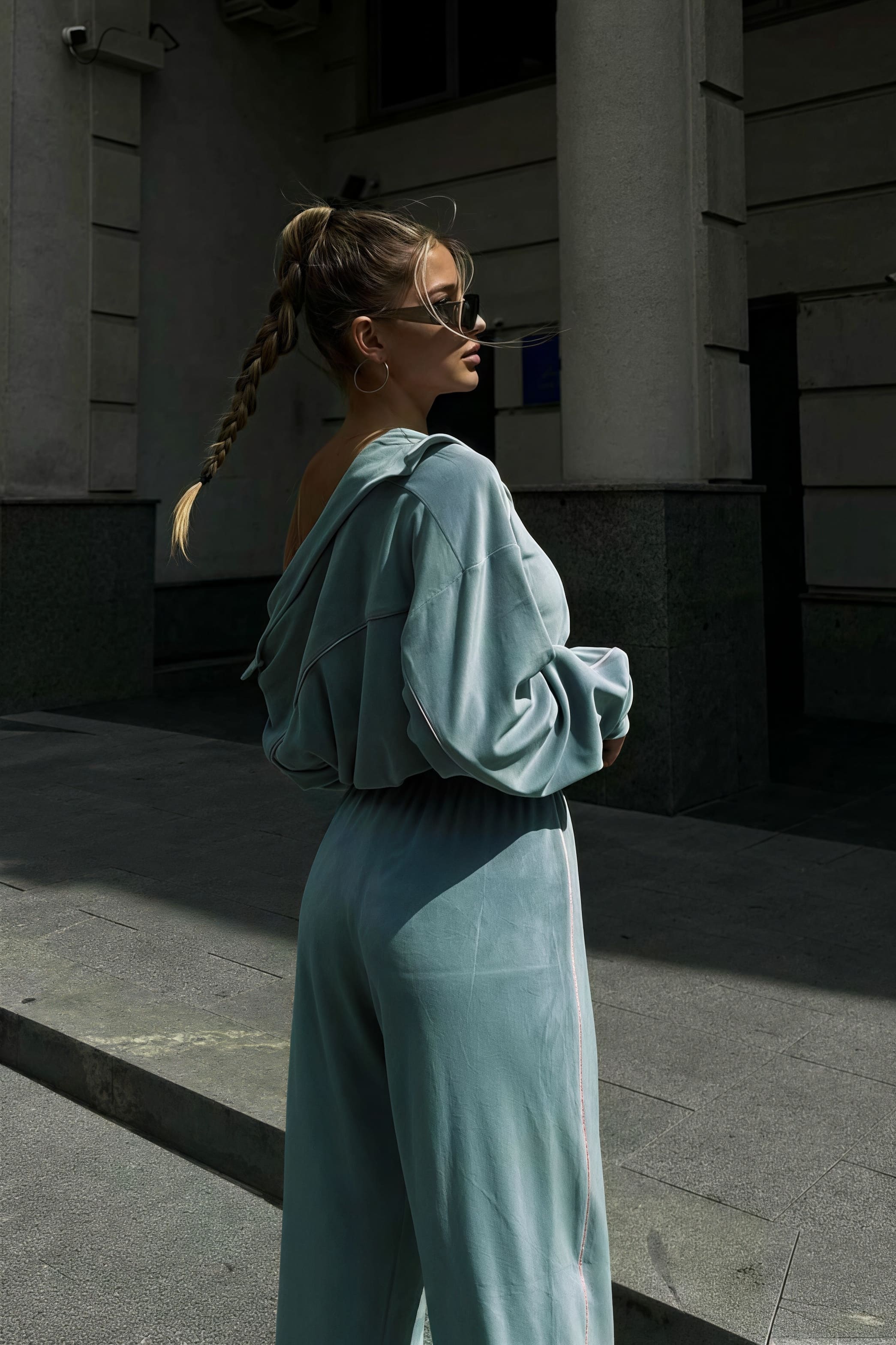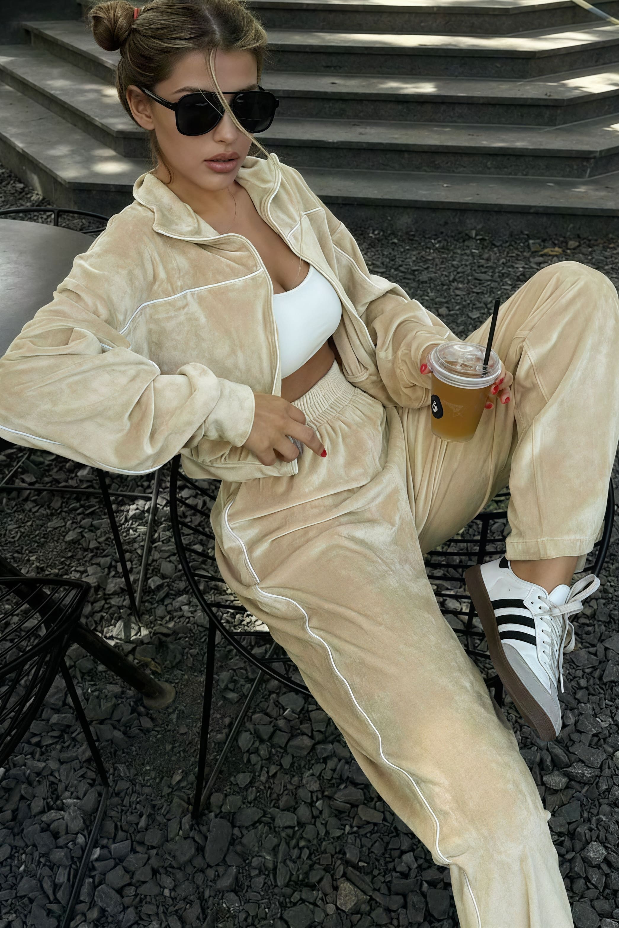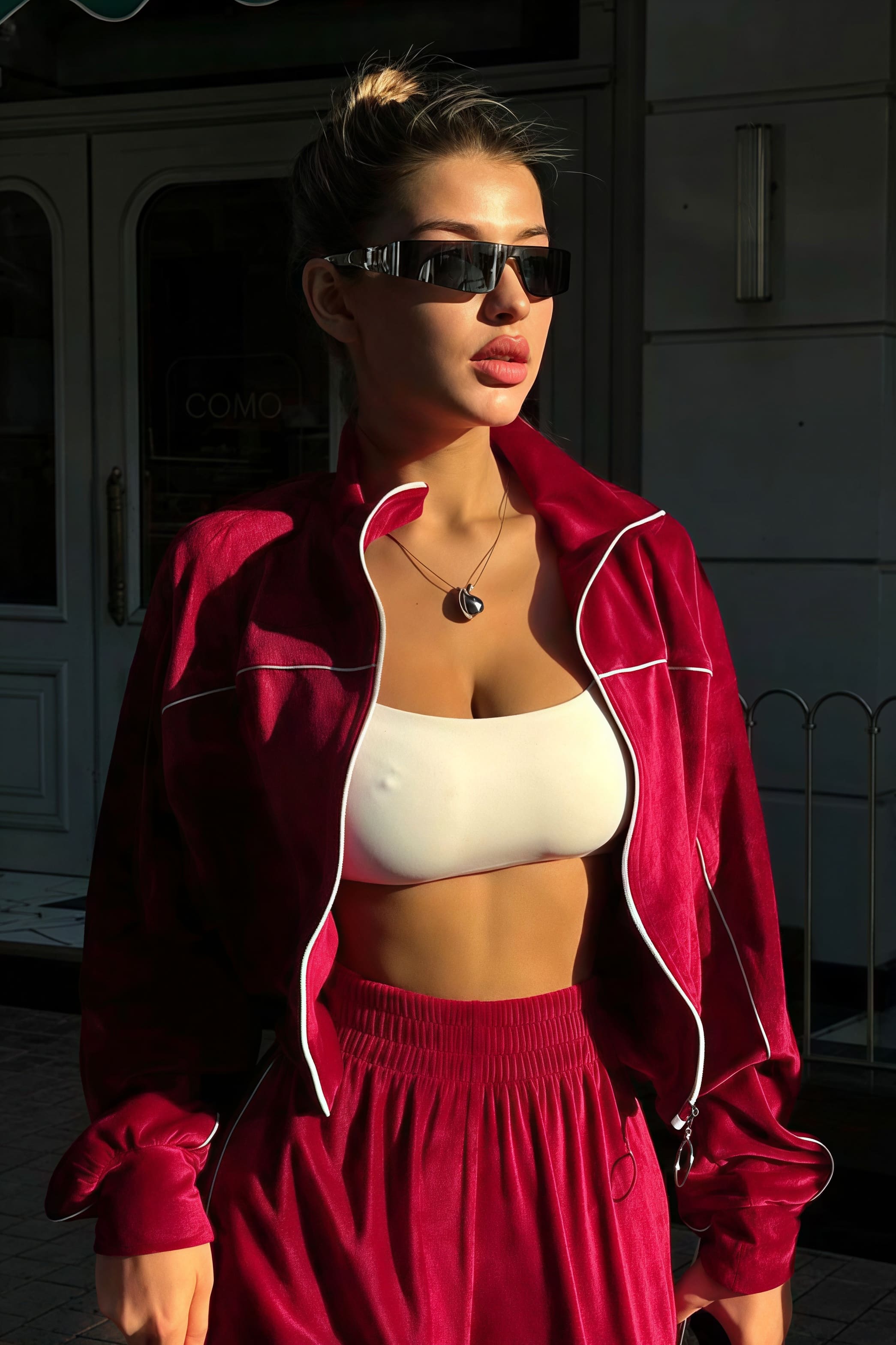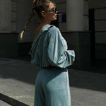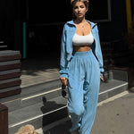 Todelt sæt med lange ærmer, en atletisk fløjlskrave og lynlåslukning.